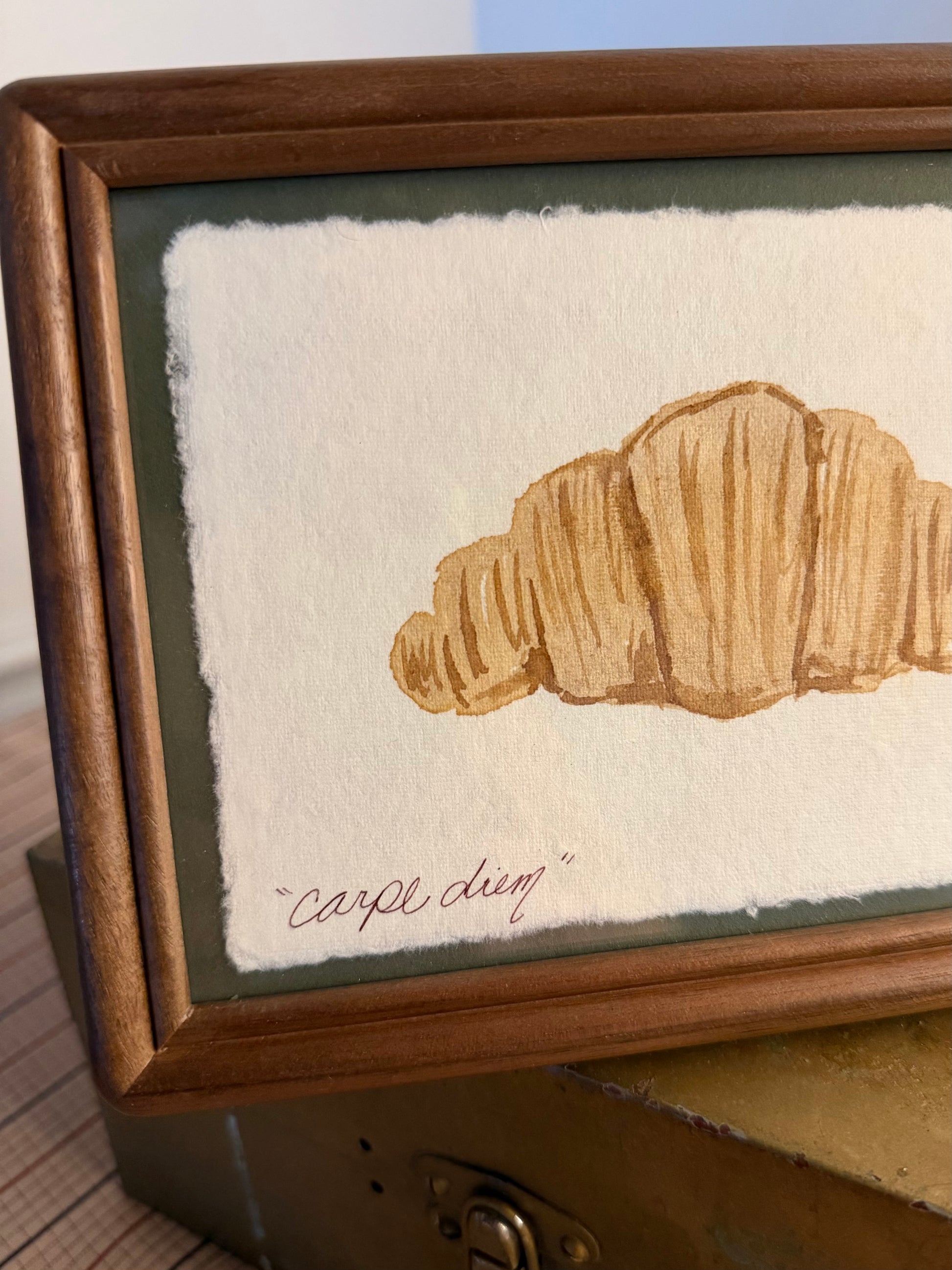 "Carpe Diem" | Croissant on Green| 4x6 Coffee Painting
