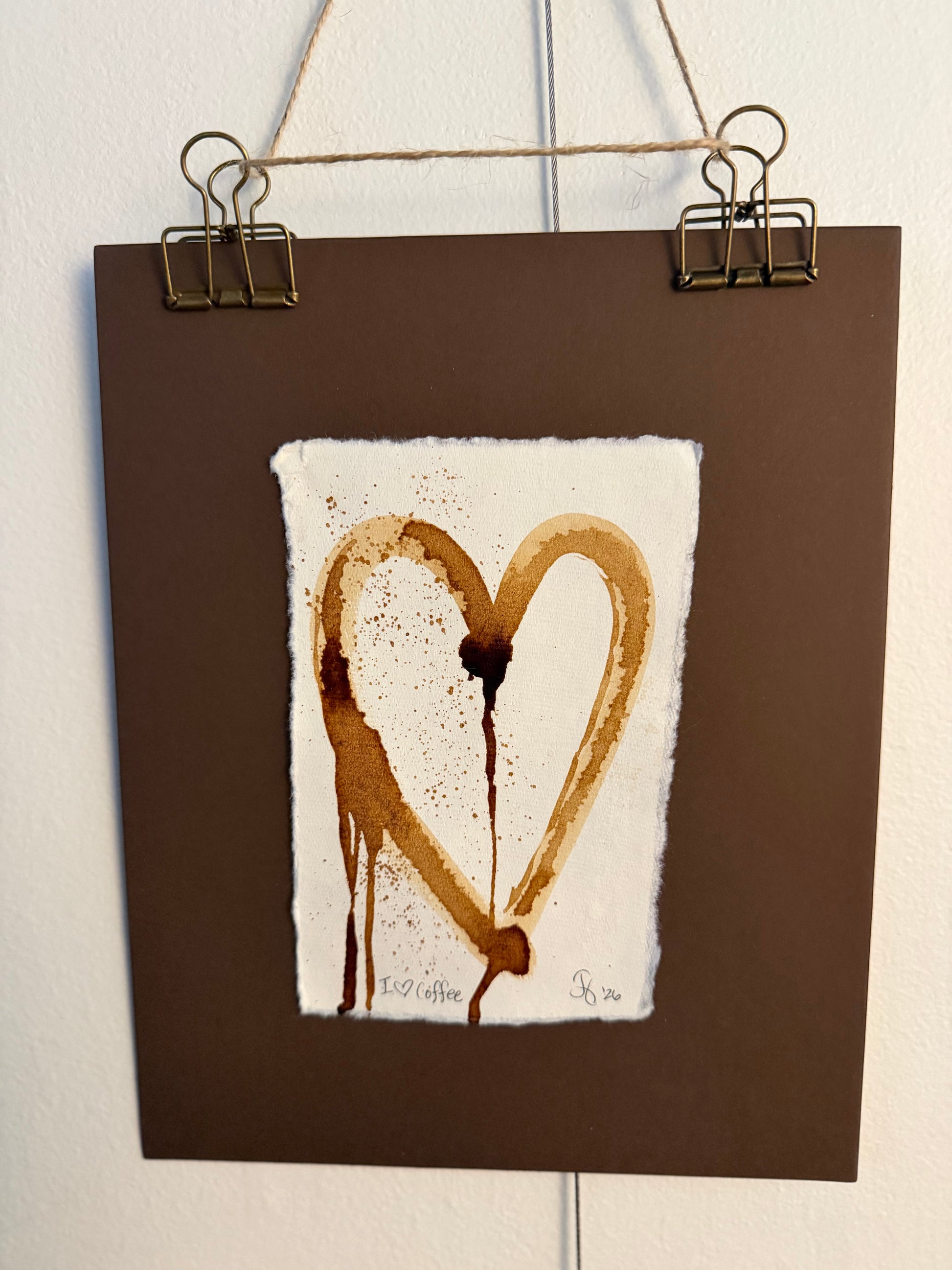 Unlike traditional framing, these pieces “float” on matte board and are displayed with vintage-style binder clips, giving them an open, airy feel. The exposed edges and visible paper texture celebrate the handmade process and add to the monochromatic warmth of the coffee tones.