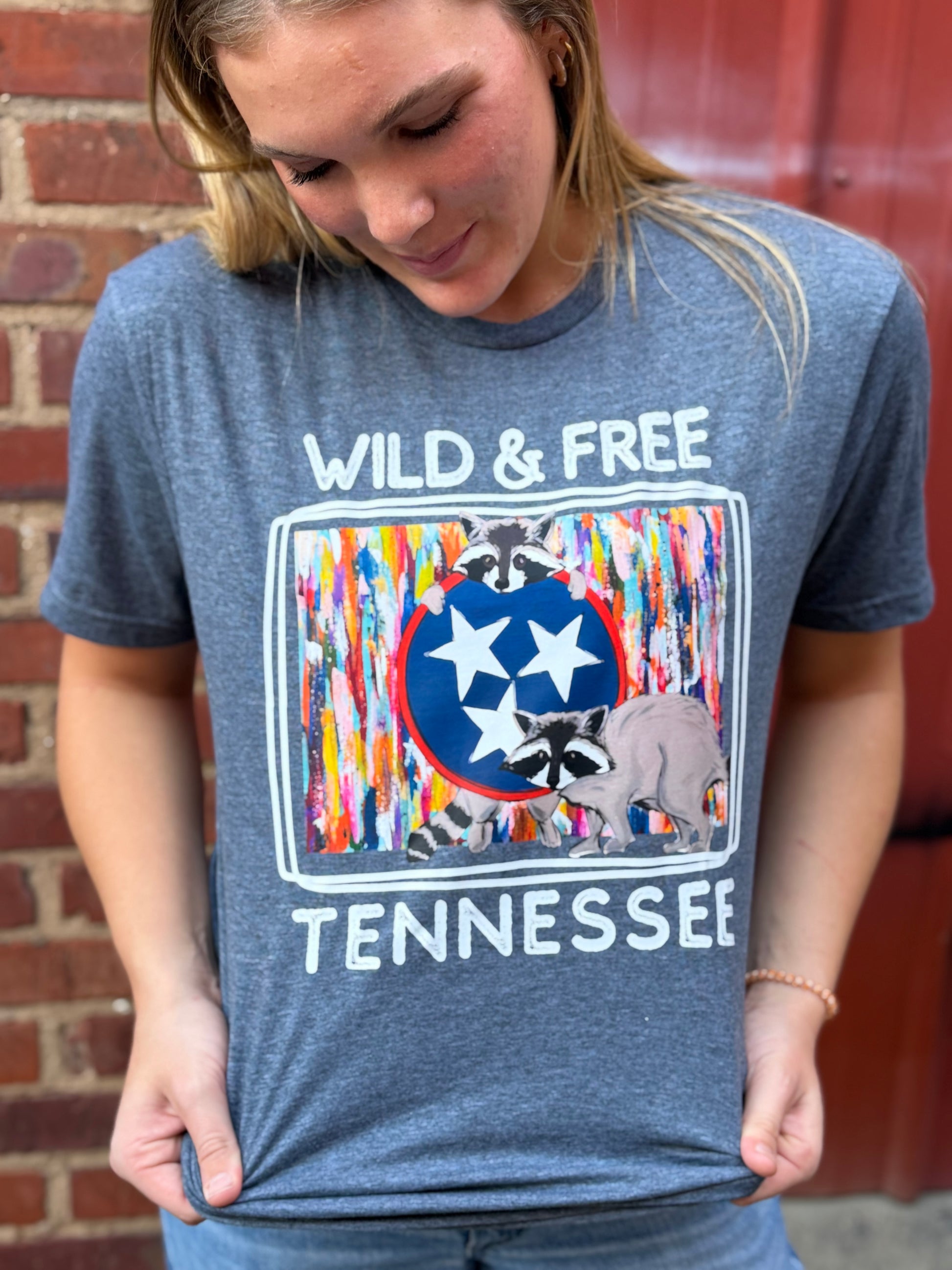 Show your Tennessee pride with a little raccoon mischief on the side! This ultra-comfy charcoal tee features the original artwork from the Main Street Union City–commissioned “Wild & Free Tennessee” dumpster mural by local artist Abi Hellmich.